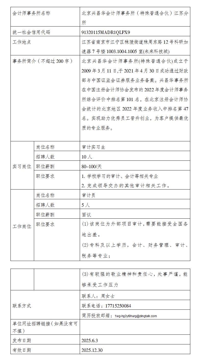 北京兴昌华会计师事务所(特殊普通合伙)江苏分所招聘信息